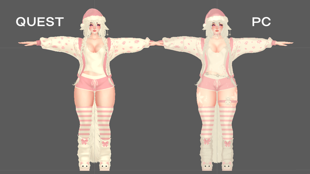 - Lots of Outfit Toggles: Cardigan, Tank Top, Shorts, Bikini, Onesie & lots of accessories! (4 material swaps! pink, blue, grey, or black + hue shift for all colored parts! mix & match colors for a unique look!)